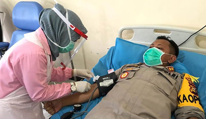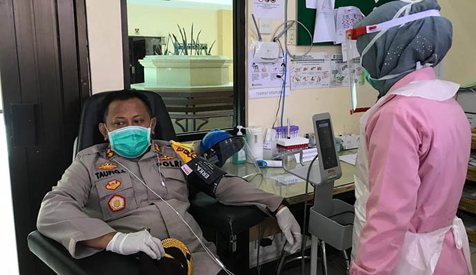 Sebanyak 4 Perwira dari Kepolisian Polres Meranti bersama Kapolres Meranti AKBP Taufiq Lukman Nurhidayat SIK MH melakukan donor darah di RSUD Meranti. Jum’at, (17/04/2020).