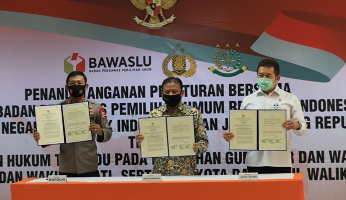 Badan Pengawas Pemilihan Umum (Bawaslu), Polri, dan Kejaksaan Agung (Kejagung) melakukan penandatanganan Peraturan Sentra Penegakan Hukum Terpadu (Gakkumdu) di Jakarta, Senin (20/7/2020). Polri bersama aparat penegak hukum dan penyelenggara Pilkada 2020 memastikan akan pengawasan ketat pelaksanaan pesta demokrasi itu meski dilaksanakan di tengah pandemi Covid-19.