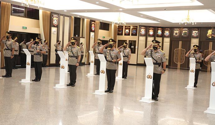 Kapolri Jenderal Idham Azis memimpin langsung upacara Sertijab tersebut di Mabes Polri, Jumat (20/11/2020). Turut hadir Wakpolri Komjen Gatot Eddy Pramono dan sejumlah Pejabat utama Mabes Polri.