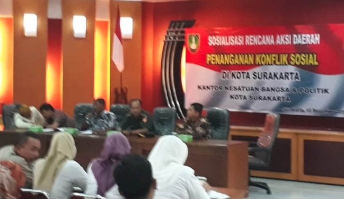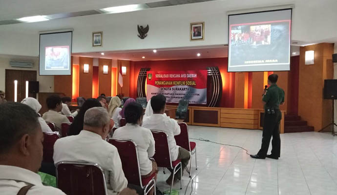 Bertempat di Lantai V Gedung Tawang Praja Komplek Balaikota Surakarta Jl. Jenderal Soedirman No. 2 Kel. Kampung Baru Kec. Pasar Kliwon Kota Surakarta Kepala Staf (Kasdim) 0735 Surakarta Mayor Inf Alfian Yudha menjadi pemateri pada Sosialisasi Rencana Aksi Daerah Penanganan Konflik Sosial di Kota Surakarta yang di selenggarakan oleh Kesbangpol Kota Surakarta dengan Penanggung jawab kegiatan Indradi, AP. SH. MM (Ka Kesbangpol Kota Surakarta) yang dihadiri ± 50 orang, Kamis (12/12/2019).