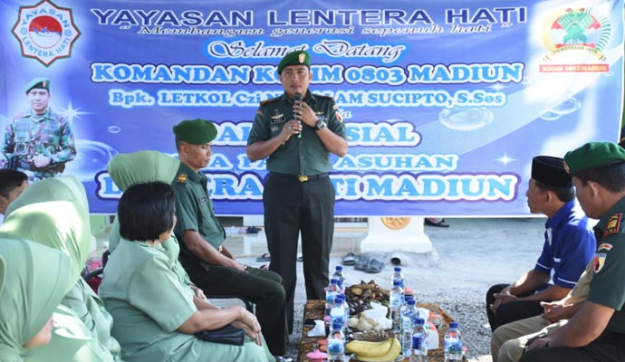 Sementara, Ketua Yayasan LKSA Panti Asuhan Lentera Hati Bapak Herdi Sutoyo menyampaikan terimakasihnya kepada Dandim 0803/Madiun,”Selaku pengasuh, kami mengucapkan terimakasih kepada Bapak Dandim beserta Ibu dan jajaran Kodim 0803/Madiun yang telah memberikan perhatiannya kepada anak yatim di panti ini,” ucapnya.