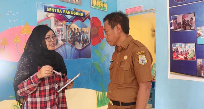 2. Fitria Hima Mahligai, (kiri) Training Specialist Primary Tanoto Foundation Jambi sedang berbincang dengan Kepala Dinas Pendidikan Tanjung Jabung Timur, Junaedi Rahmat, di sela simulasi pelatihan program PINTAR, selasa (30/10).