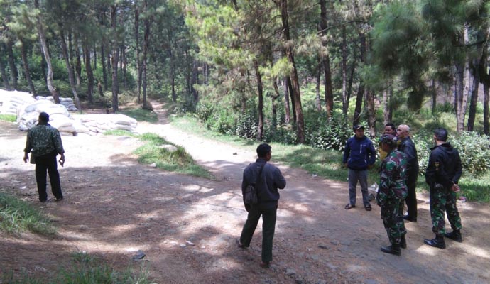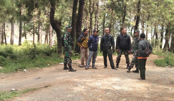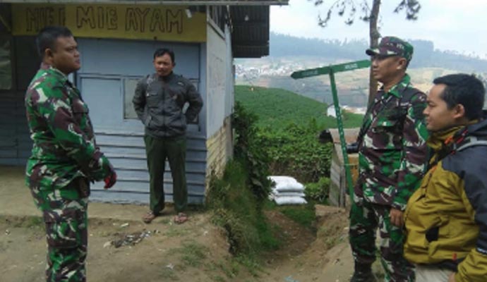 Komandan Koramil 10/Sirampog Kodim 0713/Brebes Kapten Inf Muhrodi yang di dampingi Pasiops Lettu Kavaleri Eko dan Bintara Tinggi Staf Intelijen Peltu Sugiharto meninjau langsung lokasi yang akan di jadikan jalur evakuasi Gunung Slamet. Senin (12/08/2019).