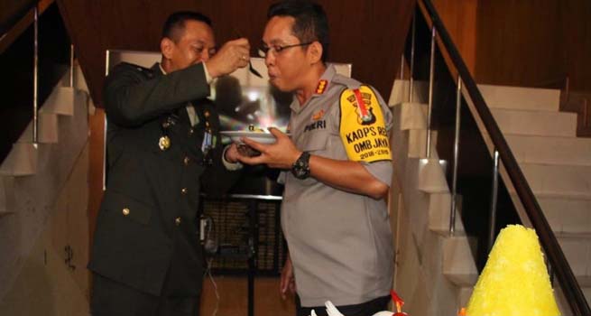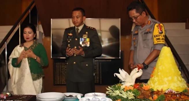Acara peringatan HUT ke 73 TNI di Makodim 0501/JP BS juga dilakukan pemotongan tumpeng. Suasana pun semakin hangat saat Letkol Inf Wahyu Yudhayana dan Kombes Pol Roma Hutajulu bersuapan potongan nasi tumpeng.