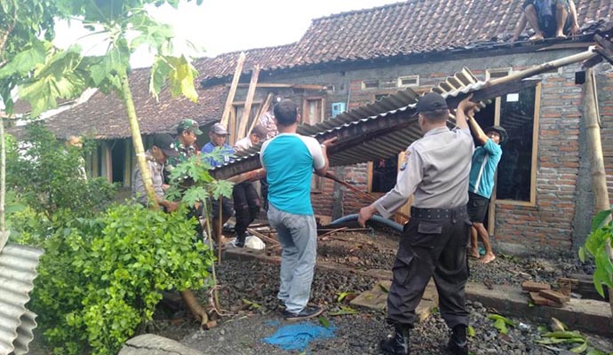 Dengan sigap anggota Koramil 0803/03 Balerejo, Kodim 0803/Madiun bersama anggota Polsek Balerejo mendatangi rumah warga yang tekena musibah dan melaksanakan kerja bakti membersihkan puing-puing reruntuhan atap.