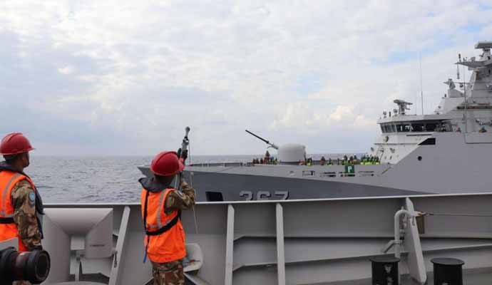 Selanjutnya dikatakan olehnya, awak kapal perang jenis Corvette milik TNI Angkatan Laut tersebut langsung melaksanakan latihan berseri pembekalan di laut / Mailbag Transfer, dimana KRI SHN-366 mengirimkan secara simbolis Welcome Package serta pengiriman bendera PBB.