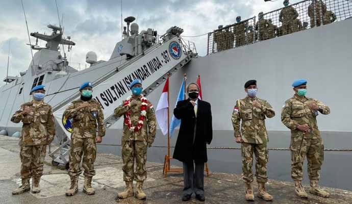 KRI Sultan Iskandar Muda-367 yang dipimpin Letkol Laut (P) Abdul Haris beserta Satgas Maritime Task Force (MTF) XXVIII-M/ UNIFIL tiba di pelabuhan Beirut, Lebanon yang merupakan tujuan akhir pelayaran sebelum mengawali tugas misi perdamaian, Sabtu (3/4/2021).
