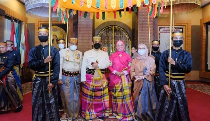 Pantauan Peliput, terlihat juga dalam penyambutan, payung kuning persegi dijunjung empat lelaki mengiringi langkah Kapolda dan Ibu Shanty Merdisyam di atas bentangan kain putih menuju pintu masuk ruangan. Dan Bupati Bone Dr A Fahsar M Padjalangi turut bersama mengiringi.