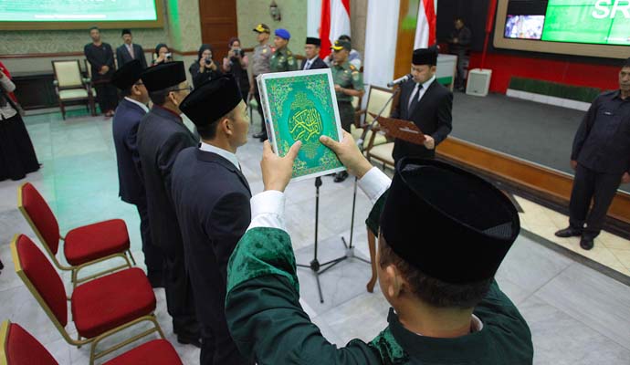 Wali Kota Bogor Bima Arya melantik tiga orang pejabat tinggi pratama (eselon II) di lingkungan Pemerintah Kota Bogor di ruang Paseban Sri Bima, Gedung Balai Kota Bogor, Rabu (27/3/2019). Dalam kesempatan itu, Bima Arya meminta kepada para pejabat yang dilantik untuk menandatangani pakta integritas dan siap untuk digeser atau diberhentikan jika kinerjanya tidak sesuai yang diharapkan.