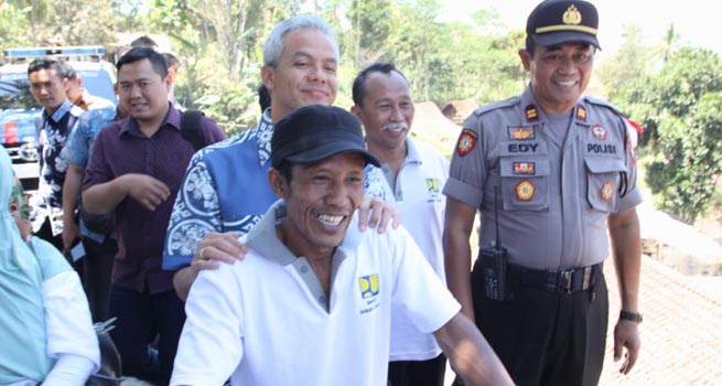 Setelah turun dari mobil H 1, Ganjar langsung bertanya pada warga yang tengah menyambut di Dusun Gadingan Desa Sukorejo Kecamatan Kajoran.