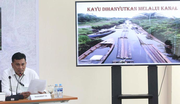 Dalam penindakan tersebut, penyidik menemukan pekerja tersangka M yang sedang memindahkan kayu dari dalam parit/kanal. Sementara, mobil-mobil truck yang sedang memindahkan kayu olahan dari tempat penumpukan ke gudang tersangka M.