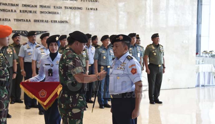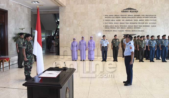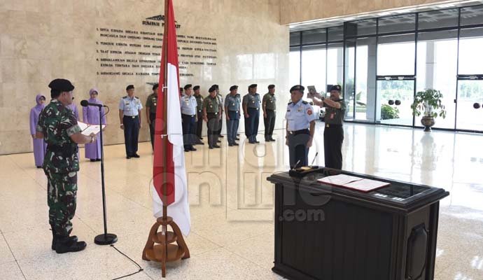 Penandatanganan Pakta Integritas dan penyerahan jabatan Aslog dari Panglima TNI kepada Marsda TNI Kukuh Sudibyanto serta pengambilan sumpah disaksikan oleh Kababinkum TNI Mayjen TNI Joko Purnomo, S.H., M.H. serta Danpom TNI Mayjen TNI Dedy Iswanto, S.E.