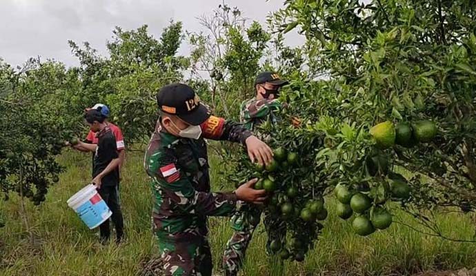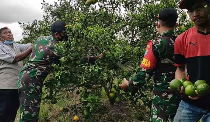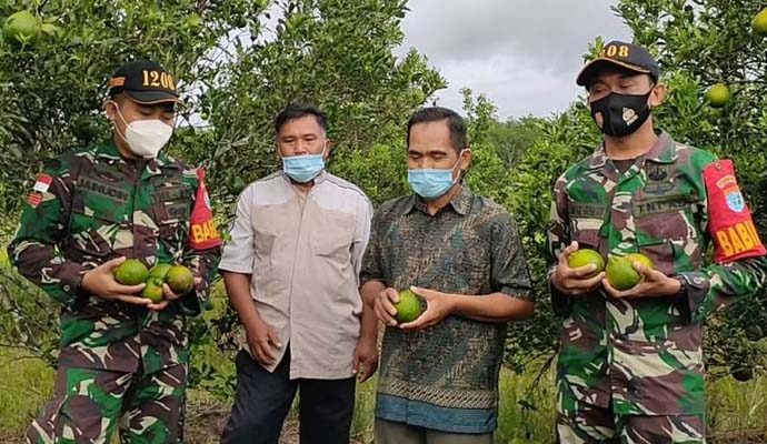 Kodim 1208/Sambas melalui Koramil 1208-03/Tebas, Bintara Pembina Desa (Babinsa) Praka Zainudin bersama Serda Andre saat berada di perkebunan jeruk bersama masyarakat dan petani jeruk di Desa Makrampai, dalam mendukung pertumbuhan ekonomi masyarakat pada saat situasi pandemi Covid- 19.