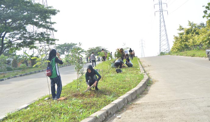 Hari itu kegiatan dimulai dengan membersihkan ilalang dan sampah plastik yang bertebaran, terutama di saluran drainase. Hasilnya, terkumpul 8 karung sampah yang selanjutnya dibuang ke TPST Katulampa. Ada sekitar 70 – an mahasiswa dan warga setempat yang terlibat. Dilanjut dengan serah terima sekitar 500 batang bibit sebelas jenis pohon dan penanaman bibit pohon di median jalan dan di sekitar danau.