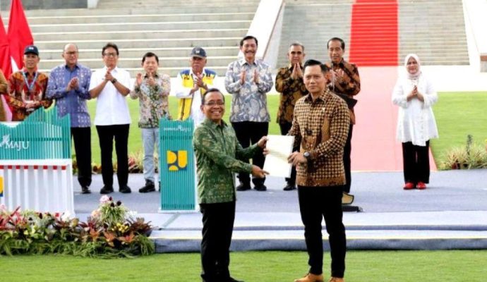INILAHONLINE.COM, KALTIM – Menteri Agraria dan Tata Ruang/Kepala Badan Pertanahan Nasional (ATR/BPN), Agus Harimurti Yudhoyono (AHY) serahkan sertipikat tanah elektronik hak pakai untuk Istana Negara dan Istana Garuda Ibu Kota Nisantara (IKN) di kalimantan. Penyerahan yang dilakukan AHY saat mendampingi Presiden Joko Widodo dalam Peresmian Istana Negara di IKN), Provinsi Kalimantan Timur, Jumat (11/10/2024).