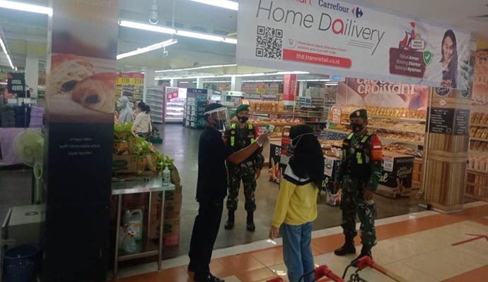 Dalam giatnya, para aparat jajaran Kodim 0803/Madiun tersebut juga turut mendampingi petugas sekuriti Carrefour Kota Madiun di Jl. Setiabudi, Oro-oro Ombo, Kec. Kartoharjo, Kota Madiun dalam pelaksanaan protokol kesehatan guna mencegah penularan covid-19, Minggu (19/7/2020).