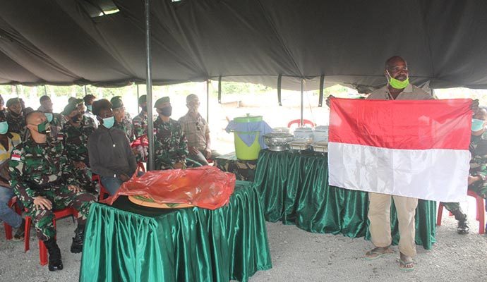 Anas Mogujai (55) Wakil Kepala Adat Kampung Bupul saat menerima bendera Merah Putih dari Dansatgas menuturkan sekelumit sejarah mengenai pertama kalinya Bendera Merah Putih dikibarkan oleh suku Yei di Kampung Kweel, Distrik Elikobel, Kabupaten Merauke pada tanggal 15 Agustus 1961 (sebelum bendera Merah Putih berkibar di Merauke). “Kami sangat berterima kasih kepada pemerintah dan TNI atas kepedulian dan perhatiannya kepada warga perbatasan,” ujarnya.(Badarudin)
