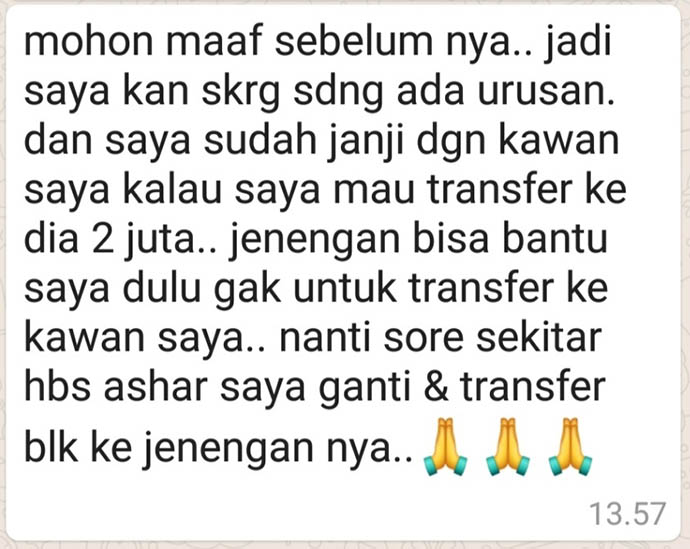 Dalam tangkpan layar WA, pelaku mengirim pesan “mohon maaf sebelumnya, jadi saya kan skrg sdng ada urusan dan saya sudah janji dgn kawan saya kalau mau transfer ke dia 2 juta… jenengan bisa bantu saya dulu gak untuk transfer ke kawan saya.. nati sore sekitar hbs ashar saya ganti & transfer blk ke jenengan nya.. “