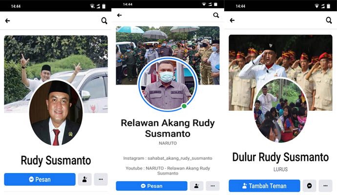 Menurut tangkapan layar, ada tiga akun FB dengan mengatasnamakan “Relawan Akang Rudi Susmanto, “Dulur Rudy Susmanto” dan “Rudy Susmanto”. Madus operandi yang digunakan oleh pelaku dengan cara mengirim pesan ke pengguna akun FB orang lain melalui inbox (masenger-red), dengan mengirim pesan emoticon (emot-red) “lambaian tangan”.