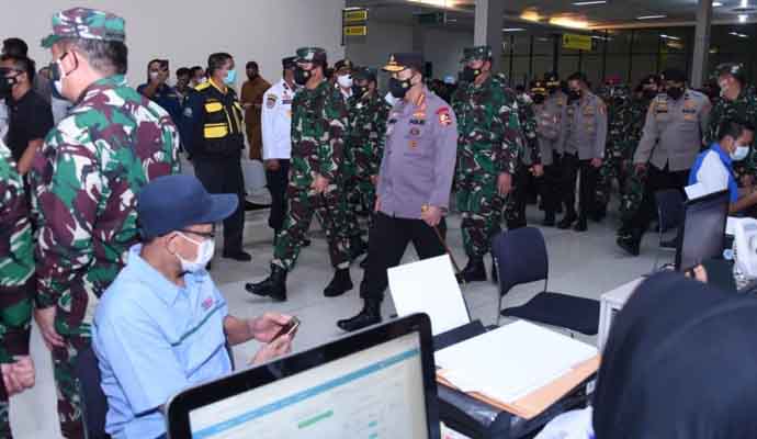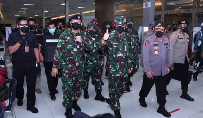 INILAHONLINE.COM, JAKARTA — Panglima TNI Marsekal TNI Hadi Tjahjanto S.I.P., didampingi Kapolri Jenderal Pol Drs. Listyo Sigit Prabowo, M.Si, dan Kasal Laksamana TNI Yudo Margono, S.E., M.M. memantau Serbuan Vaksinasi Covid-19 bagi masyarakat Pelabuhan, bertempat di Pelabuhan Indonesia (Pelindo) II, Tanjung Priok, Jakarta Utara, Rabu (23/6/2021).