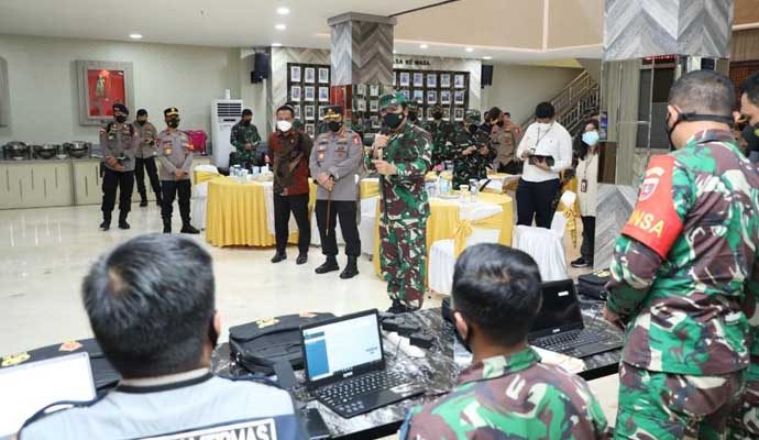 INILAHONLINE.COM, SULSEL — Panglima TNI Marsekal TNI Hadi Tjahjanto, S.I.P., bersama Kapolri Jenderal Pol Drs. Listyo Sigit Prabowo, M.Si., memimpin rapat terkait penanganan Covid-19 di wilayah Sulawesi Selatan sekaligus melaksanakan pengecekan kemampuan para Babinsa, Babinpotmar, Babinpotdirga dan Bhabinkamtibmas dalam menggunakan Aplikasi Silacak dan Inarisk, bertempat di Mapolda Sulawesi Selatan, Sabtu (07/08/2021).