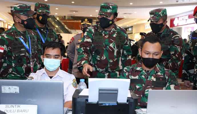 INILAHONLINE.COM, PONTIANAK — Panglima TNI Marsekal TNI Hadi Tjahjanto, S.I.P., bersama Kapolri Jenderal Pol Drs. Listyo Sigit Prabowo, M.Si, dan Kepala BNPB Letjen TNI Ganip Warsito, S.E, M.M., meninjau langsung serbuan vaksinasi di Ayani Mega Mall Pontianak dan SMA Negeri 1 Pontianak, Kalimantan Barat, Rabu (8/9/2021).