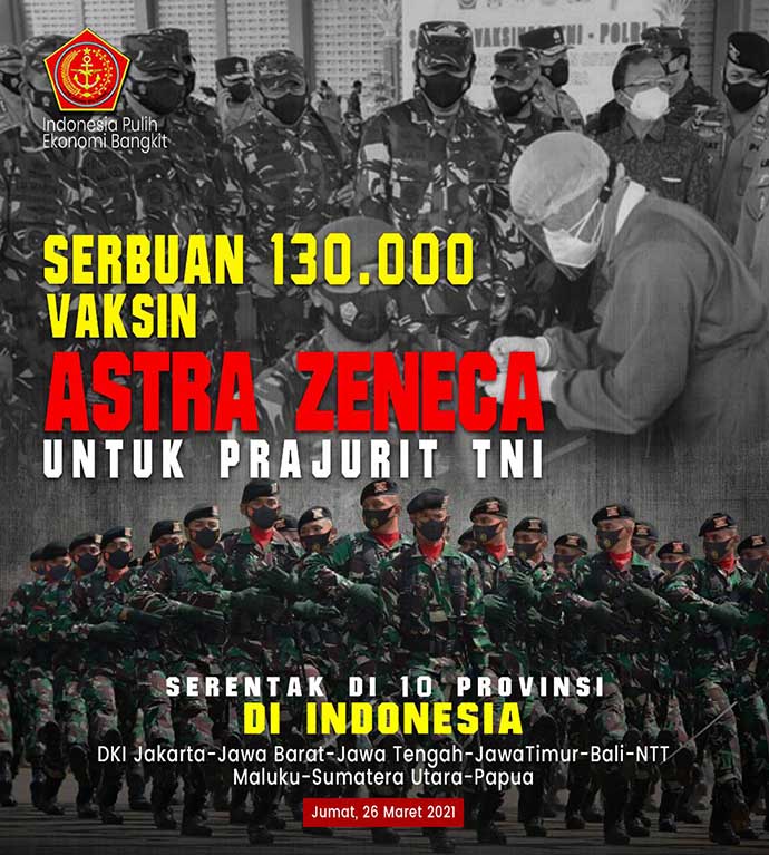 Saat ini, TNI di bawah Komando Panglima TNI Marsekal TNI Hadi Tjahjanto, S.I.P., langsung memerintahkan pelaksanaan serbuan 130.000 Vaksin Covid-19 AstraZeneca yang diberikan oleh Pemerintah melalui Menteri Kesehatan bagi seluruh Prajurit TNI yang belum mendapatkan Vaksin di 10 Provinsi.