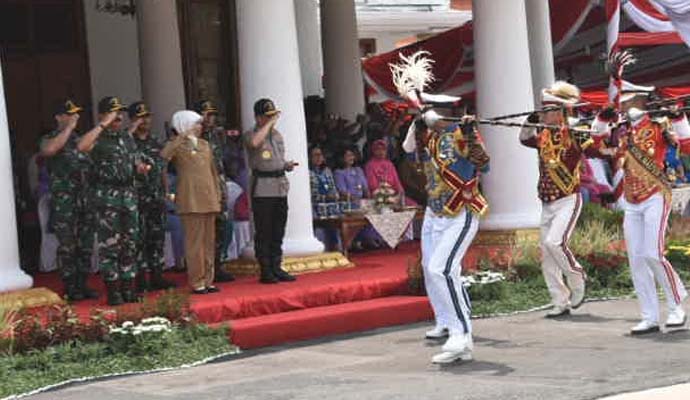 Panglima TNI, Marsekal TNI Hadi Tjahjanto memimpin berlangsungnya upacara Latsitardanus ke-XXXIX yang berlangsung di Gedung Grahadi, Kota Surabaya. Senin, 1 April 2019.