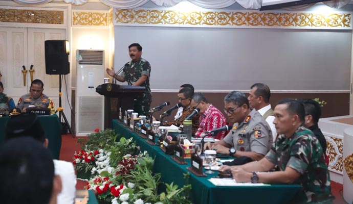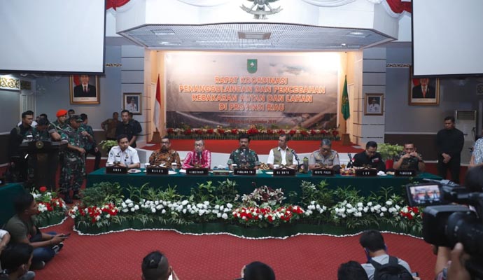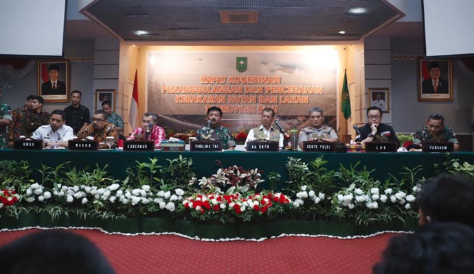 Panglima TNI Marsekal TNI Hadi Tjahjanto, S.I.P. didampingi Gubernur Riau Drs. H. Syamsuar, Kepala Badan Nasional Penanggulangan Bencana (BNPB) Letjen TNI Doni Munardo memimpin Rapat Koordinasi (Rakor) Penanggulangan dan Pencegahan Kebakaran Hutan dan Lahan (Karhutla) di Provinsi Riau, bertempat di Balai Serindit, Gedung Daerah Jl. Diponegoro No. 20, Kota Pekanbaru, Provinsi Riau, Sabtu (14/9/2019).