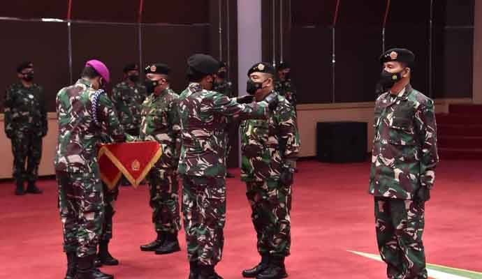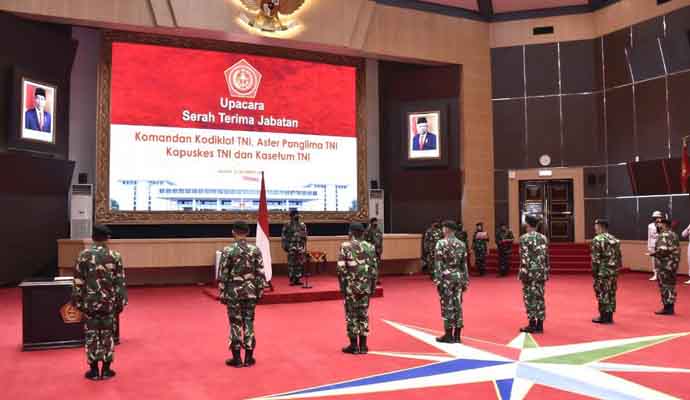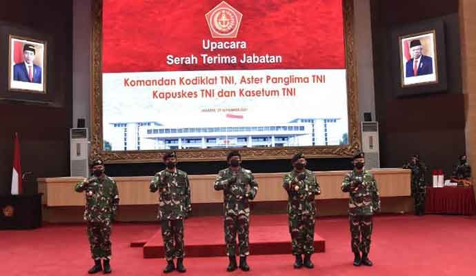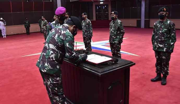 INILAHONLINE.COM, JAKARTA — Panglima TNI Marsekal TNI Hadi Tjahjanto, S.I.P. memimpin upacara Serah Terima Jabatan (Sertijab) Komandan Komando Pembina Doktrin, Pendidikan dan Latihan TNI (Dankodiklat TNI), Asisten Teritorial Panglima TNI (Aster Panglima TNI), Kepala Pusat Kesehatan TNI (Kapuskes TNI) dan Kepala Sekretariat Umum TNI (Kasetun TNI), bertempat di Aula Gatot Soebroto Denma Mabes TNI, Cilangkap, Jakarta Timur, Selasa (21/9/2021).