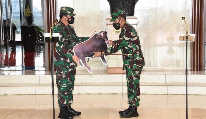 INILAHONLINE.COM, JAKARTA — Panglima TNI Marsekal TNI Hadi Tjahjanto, S.I.P. yang didampingi Kasum TNI Letjen TNI Eko Margiyono, M.A. dan Irjen TNI Letjen TNI (Mar) Bambang Suswantono, S.H., M.H., M.Tr. (Han) menyerahkan 1 ekor sapi sebagai hewan Qurban secara simbolis kepada Dandenma Mabes TNI Brigjen TNI (Mar) Oni Junianto, bertempat di Ruang Hening Mabes TNI Cilangkap, Senin (19/7/2021).