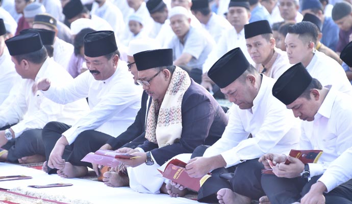 Panglima TNI, Marsekal TNI Hadi Tjahjanto, S.I.P., bersama Ketua Umum Dharma Pertiwi Ny. Nanny Hadi Tjahjanto melaksanakan shalat Idul Adha 1440 Hijriah / 2019 Masehi bersama ribuan Prajurit dan PNS TNI serta warga masyarakat muslimin/muslimat wilayah Cilangkap dan sekitarnya, bertempat di Plaza Mabes TNI Cilangkap, Jakarta Timur, Minggu (11/8/2019).