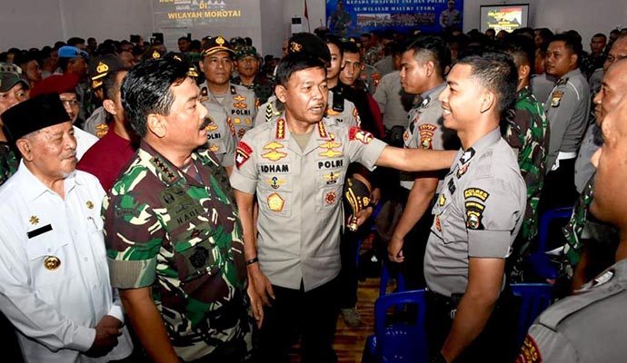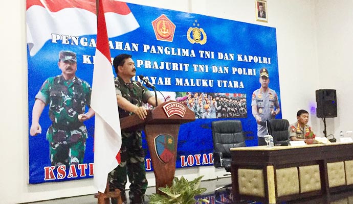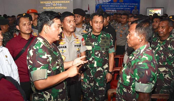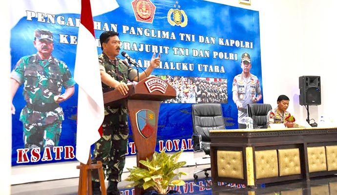 Hal tersebut disampaikan Panglima TNI Marsekal TNI Dr. (H.C.) Hadi Tjahjanto, S.I.P. didampingi Kapolri Jenderal Pol Drs. Idham Azis, M.Si. saat memberikan pengarahan kepada Komandan Satuan dan ratusan prajurit TNI-Polri se-wilayah Maluku Utara dan Morotai, bertempat di GOR Poltak Lanud Leo Watimena Morotai, Kamis (16/1/2020).