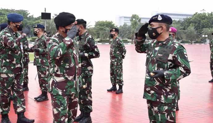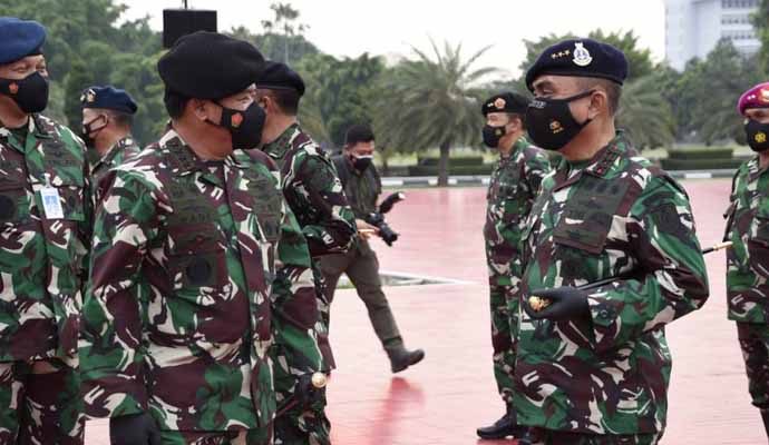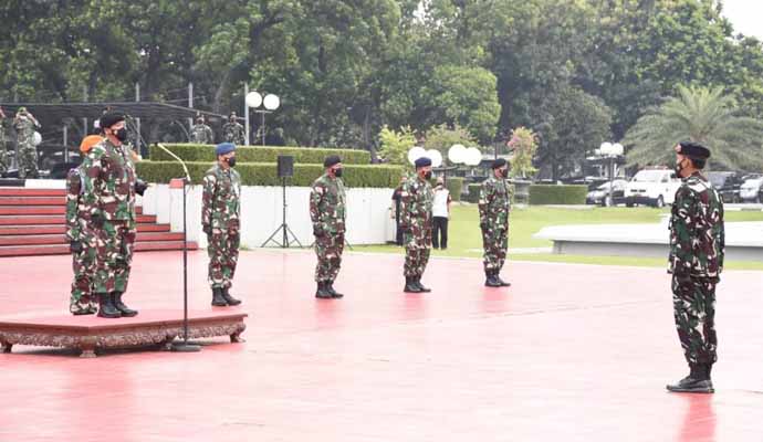 Panglima TNI Marsekal TNI Dr. (H.C.) Hadi Tjahjanto, S.I.P. menerima Laporan Korps Kenaikan Pangkat 57 Perwira Tinggi (Pati) TNI terdiri dari 16 Pati TNI AD, 23 Pati TNI AL dan 18 Pati TNI AU, bertempat di Mabes TNI, Cilangkap, Jakarta Timur, Rabu (17/3/2021).
