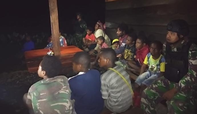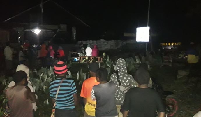 Sebagai wujud kebersamaan, pasukan Satuan Tugas Pengamanan Perbatasan (Satgas Pamtas) RI-PNG Yonif Raider 514/SY di bawah pimpinan Mayor Inf Danang Biantoro, S.I.P, M.Si. sebagai Dansatgas, menggelar acara menonton bersama Warga di halaman Pos Kostis Satgas, Kampung Karubate, Distrik Mulia, Kab. Puncak Jaya, Provinsi Papua, Senin (22/7/2019).