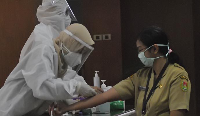 Petugas medis dari Rumah Sakit Merah Putih Kabupaten Magelang yang menggunakan Alat Pelindung Diri (APD) begitu serius, saat melakukan Rapid Test Covid – 19 terhadap 84 orang ASN di Setda Kabupaten Magelang, Jateng, termasuk para wartawan.