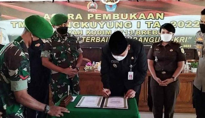 INILAHONLINE.COM, BREBES — Wakil Bupati Brebes Harjo SH mewakili Bupati Hj. Idza Priyanti SE.MH, membuka secara resmi program TNI Manunggal Membangun Desa (TMMD) Sengkuyung Tahap I TA. 2022 di Pendopo Kabupaten Brebes, Jawa Tengah. Rabu (11/5/2022).