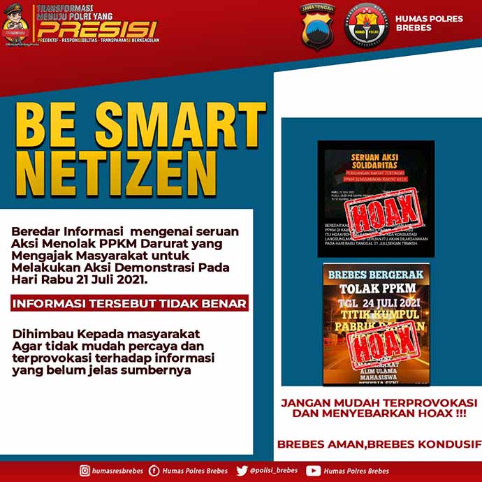 INILAHONLINE.COM, BREBES — Polisi memastikan seruan aksi penolakan pemberlakuan pembatasan kegiatan masyarakat PPKM Darurat di Kabupaten Brebes, Jawa Tengah hoax. Pelaku pembuat maupun penyebar Hoax itu kini diburu.