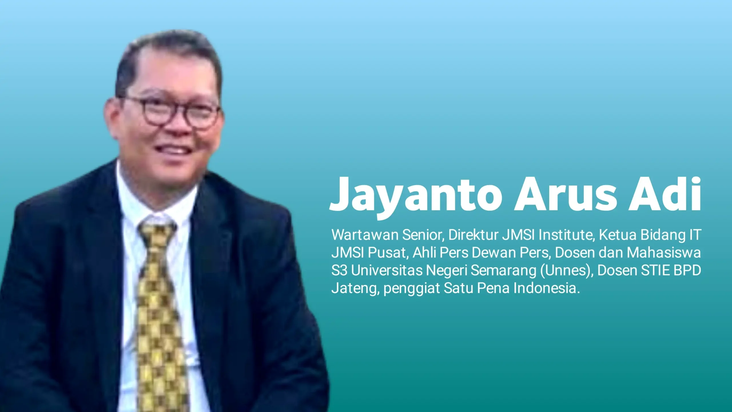 (Jayanto Arus Adi, Wartawan Senior, Ahli Pers Dewan Pers. Saat ini mengelola dan memimpin salah satu Media Online sangat berpengaruh di Jawa Tengah sebagai Pemimpin Umum juga Pemimpin Redaksi. Aktif mengajar jurnalistik di beberapa Perguruan tinggi, juga organisasi media dan penulis, yaknis JMSI dan Satu Pena)