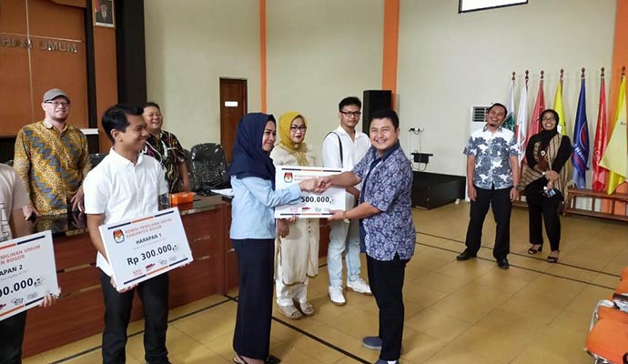 KPU Kabupaten Bogor memberikan hadiah kepada 12 orang yang terpilih sebagai juara lomba selfie Kategori “Atos Nyoblos di TPS” dan “KPPSKreatif” pada Pilpres dan Pemilu Legislatif 2019 lalu.