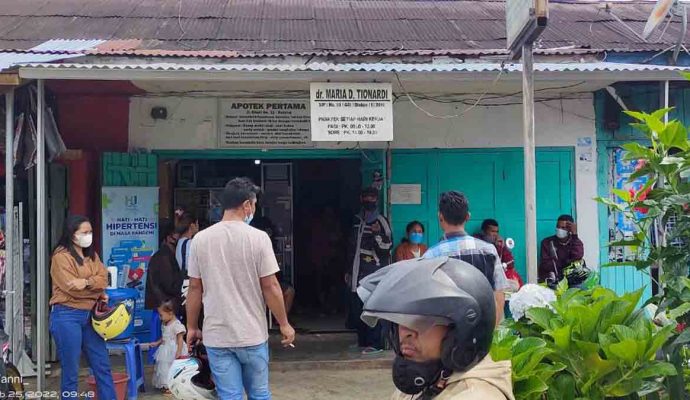 Tepat pukul 08.10 tim sudah tiba di tempat praktek dr Maria. Tidak lama kemudian, di halaman tempat praktek dan sekaligus apotek tampak masyarakat mulai berdatangan untuk ikut antri berobat.