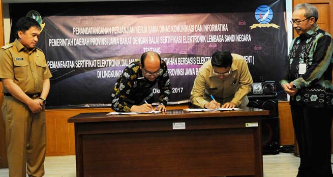 Untuk itu, Pemerintah Provinsi (Pemprov) Jawa Barat yang diwakili oleh Kepala Dinas Komunikasi dan Informatika (Diskominfo) Jabar Hening Widiatmoko melakukakan penandatanganan perjanjian kerjasama dengan lembaga Sandi Negara yang diwakili Sekertaris Utama Lembaga Sandi Negara, Syahrul Mubarak tentang pemanfaatan sertifikat elektronik dalam sistem pemerintahan berbasis elektronik.
