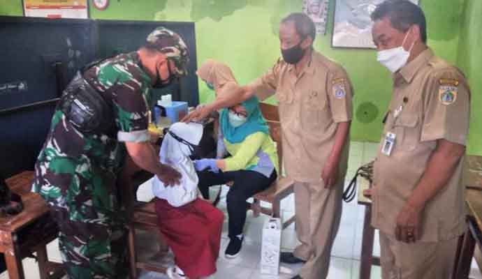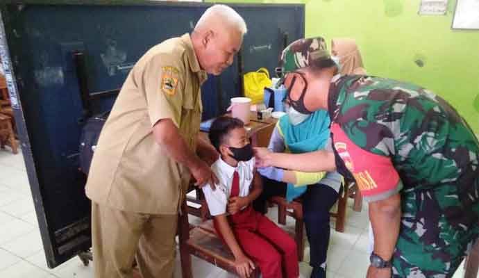 Tampak Babinsa Ciomas Koramil 12 Bantarkawung Kodim 0713 Brebes, Koptu Hudayana bersama Kepala Sekolah Darno S.Pd, memberikan motivasi kepada anak didik agar tidak takut saat diinjeksi oleh nakes dari Puskesmas Bantarkawung.
