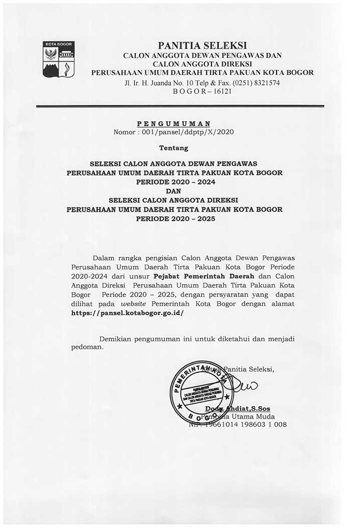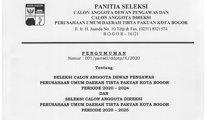 Infografis Perumda Tirta PakuanPENGUMUMAN SELEKSI CALON ANGGOTA DEWAN PENGAWAS DAN CALON ANGGOTA DIREKSI PERUMDA TIRTA PAKUAN KOTA BOGOR 2020-2024inilah online25 Oktober 202025 Oktober 2020Advert, Advertorial, Berita, Infografis, Megapolitan962 Dilihat Post Views: 962 Jangan LewatkanJutaan Rokok Ilegal dan Ribuan Minuman Beralkohol Dimusnahkan Bersama Pemkot Semarang dan Bea CukaiKomitmen Pemkot Bogor dalam Meningkatkan Mutu Pendidikan Lewat KolaborasiTingkat Kepercayaan Masyarakat Terhadap KSPP Syariah BMT BIMA Semakin TinggiKesederhanaan Bukanlah Alasan Generasi Muda Tak Berprestasi Internasional di tengah Stigma Generasi Stroberi dan Suka Nongkrong!