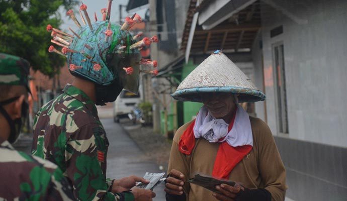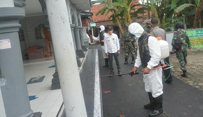 Kegiatan penyemprotan disinfektan ini, dilakukan oleh prajurit Korem 071/Wijayakusuma guna memutus rantai penyebaran pandemi Covid-19 di Desa Kedondong, Kecamatan Sokaraja, Banyumas, Selasa (21/2/2020).