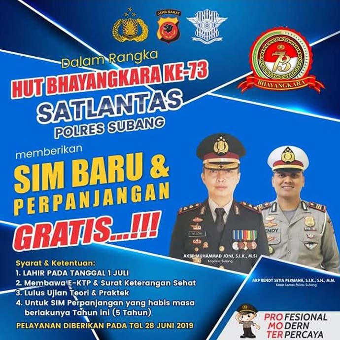 Kapolres Subang AKBP Muhamad Joni SIK mengatakan, menyambut HUT ke-73 Bhayangkara, pihaknya sudah menggelar berbagai kegiatan. “Seperti donor darah, bakti sosial dan juga lainnya. Nanti pada tanggal 28 Juni 2019, pihaknya akan memberikan pembuatan SIM dan perpanjangan gratis, bagi warga yang lahir pada tanggal 1 juli,” paparnya.