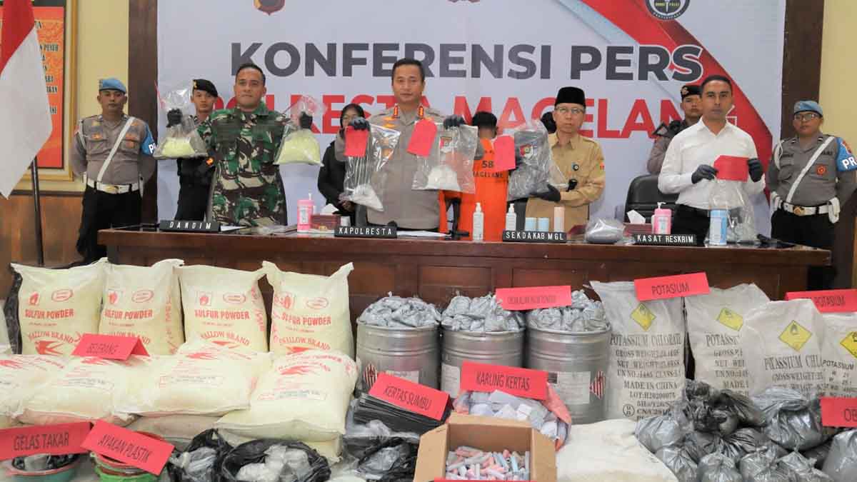 INILAHONLINE.COM, MAGELANG — Satreskrim Polresta Magelang, Jawa Tengah, berhasil mengamankan setengah ton atau sekitar 600 kilo gram lebih bahan peledak, yakni berupa obat mercon jadi dan bahan pembuat obat mercon, di dua tempat di wilayah Kabupaten Magelang, Minggu (9/4/2023) dini hari.