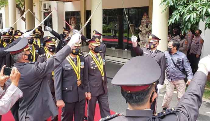 Upacara pelepasan Purna Bhakti 2021 Personel Polrestabes Semarang yang dipimpin Kapolrestabes Semarang Kombes Pol Irwan Anwar berlangsung di depan Lobby Mapolrestabes Semarang.(Suparman)