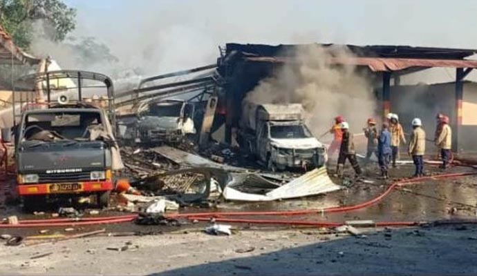 “Situasi sudah cukup tenang kemudian proses pendinginan dan pemadaman dilakukan oleh 7 unit kendaraan damkar dan sudah selesai sambil menunggu tim dari jibom pasukan Gegana hadir melakukan olah TKP dan sterilisasi,” ungkapnya.