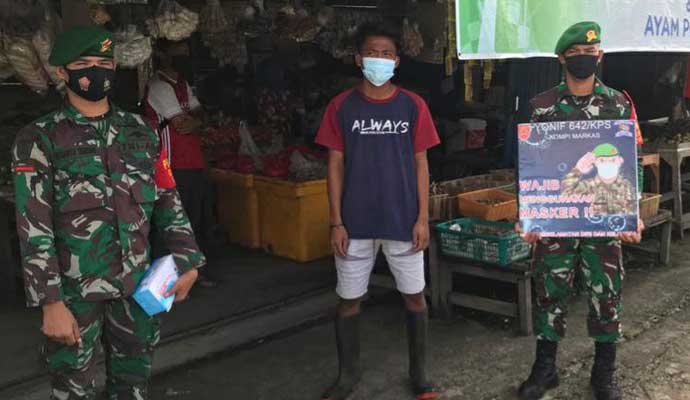 INILAHONLINE.COM, SINTANG – Untuk mencegah penyebaran Covid-19, Prajurit TNI dari Batalyon Infanteri 642/Kapuas membagikan masker di Pasar Sui Durian, Sintang, Kalbar, Rabu (9/6/2021).
